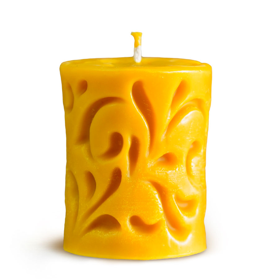 Bienenwachs Stumpenkerze, rund mit Ornamenten, 75x75x90mm