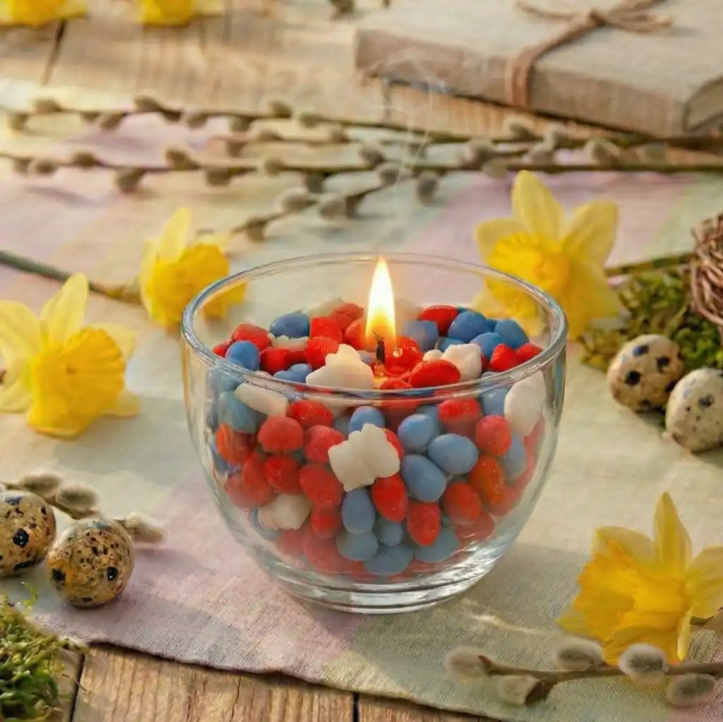 Shop / Kerzen / Valentinstag / Perlagekerze für Ostern mit rot-blauen Wachseiern und weißem Häschen